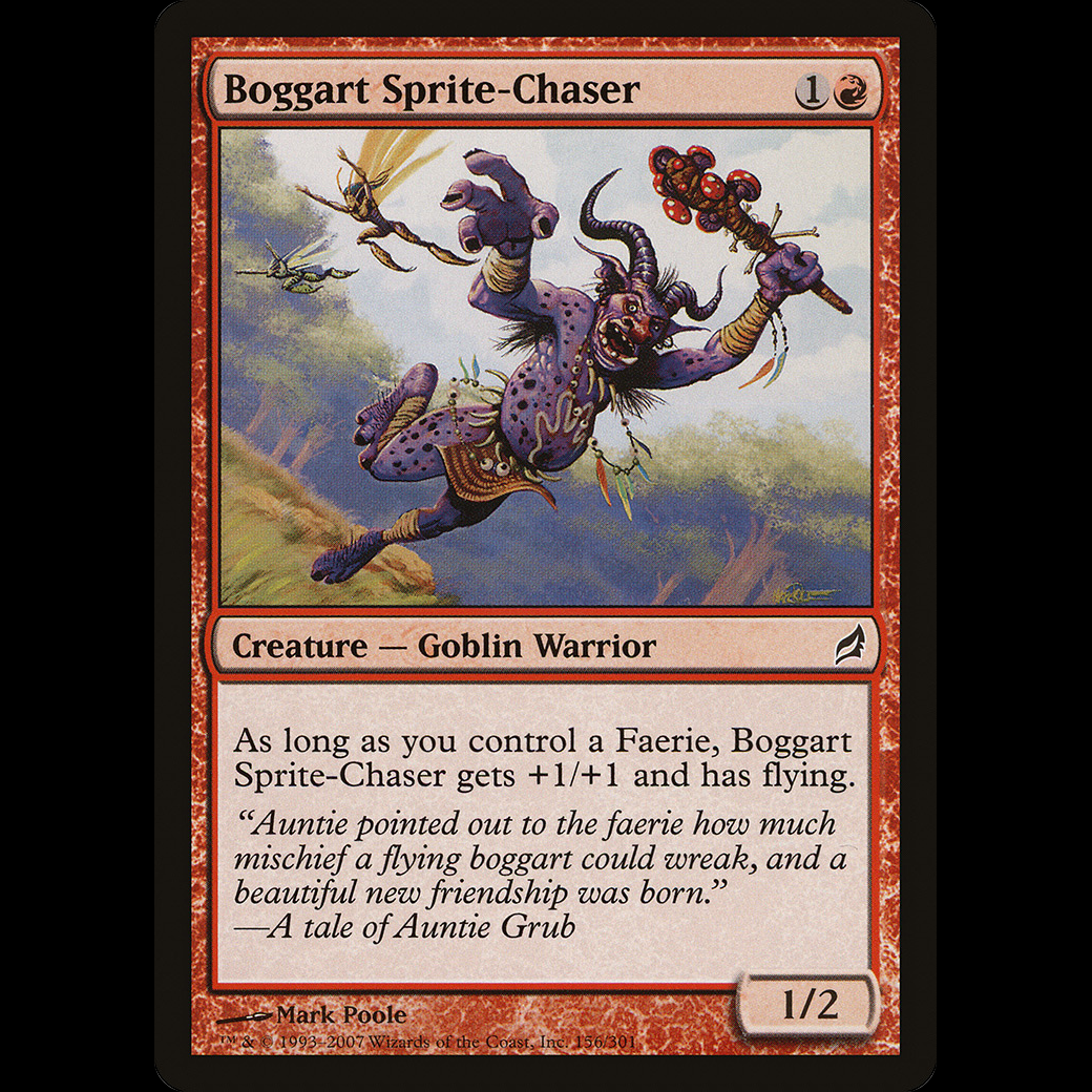 As long as you control a Faerie, Boggart Sprite-Chaser gets +1/+1 and has flying.