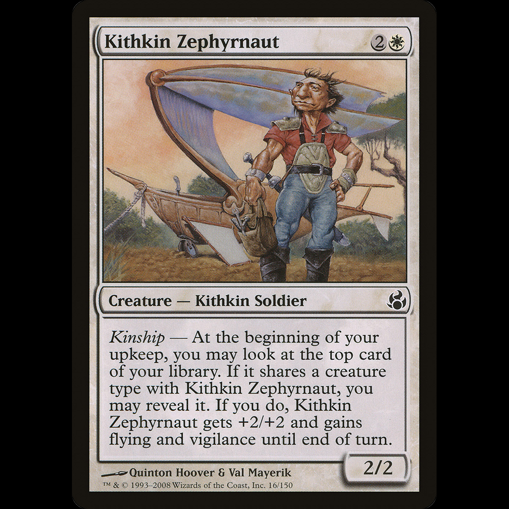 Kinship — At the beginning of your upkeep, you may look at the top card of your library. If it shares a creature type with Kithkin Zephyrnaut, you may reveal it. If you do, Kithkin Zephyrnaut gets +2/+2 and gains flying and vigilance until end of turn.