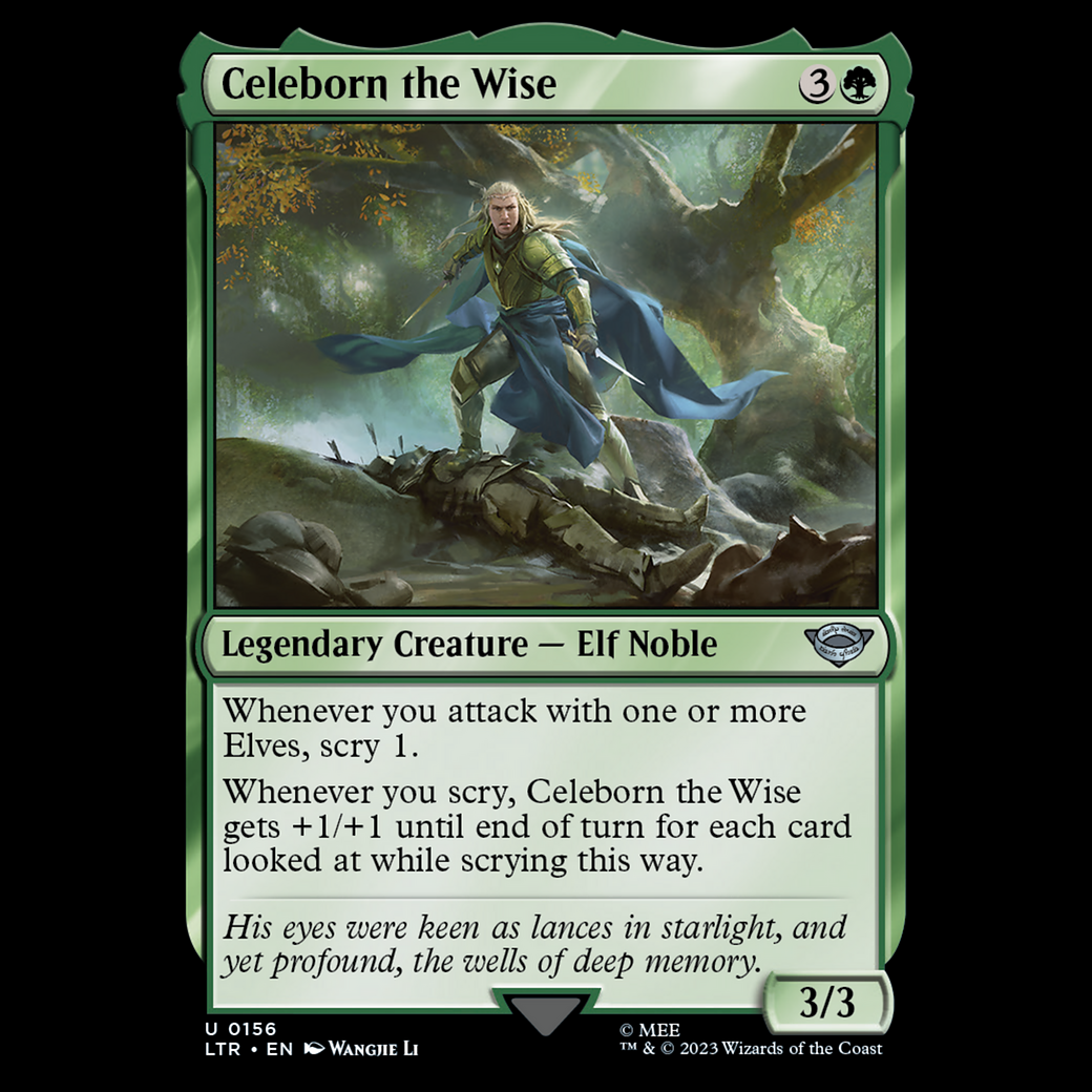 Whenever you scry, Celeborn gets +1/+1 until end of turn for each card looked at while scrying this way.