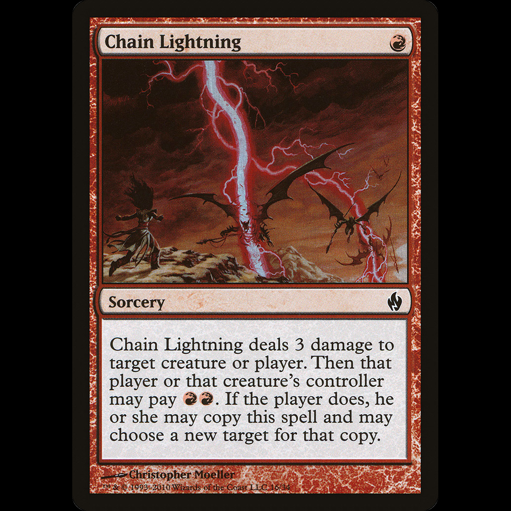 Chain Lightning deals 3 damage to any target. Then that player or that permanent's controller may pay . If the player does, they may copy this spell and may choose a new target for that copy.