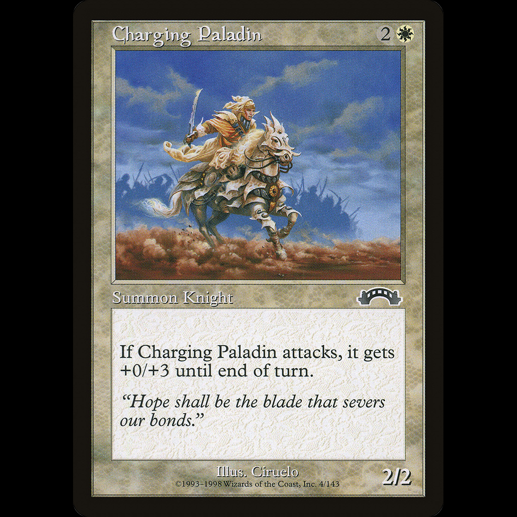 MTG Charging Paladin ExodusWhenever Charging Paladin attacks, it gets +0/+3 until end of turn.