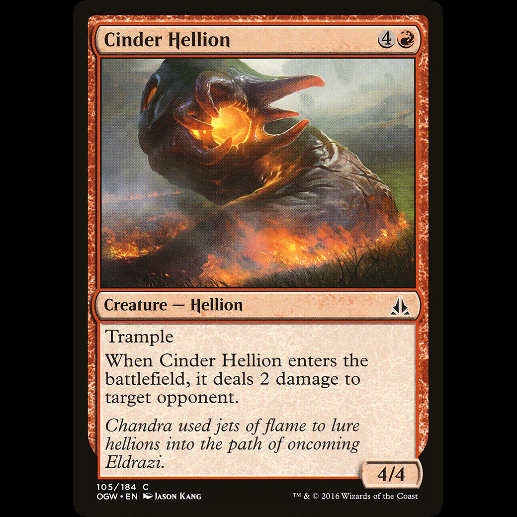 When Cinder Hellion enters the battlefield, it deals 2 damage to target opponent or planeswalker.