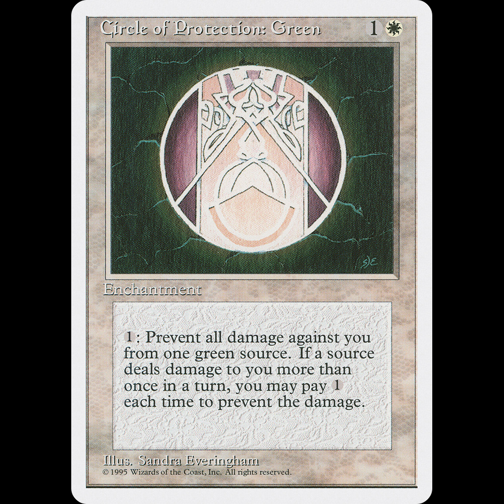 MTG Circulo de protección: Verde (Circle of Protection: Green) Fourth Edition : The next time a green source of your choice would deal damage to you this turn, prevent that damage.