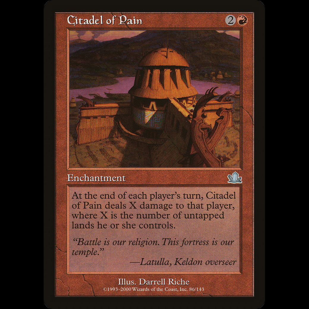 At the beginning of each player's end step, Citadel of Pain deals X damage to that player, where X is the number of untapped lands they control.