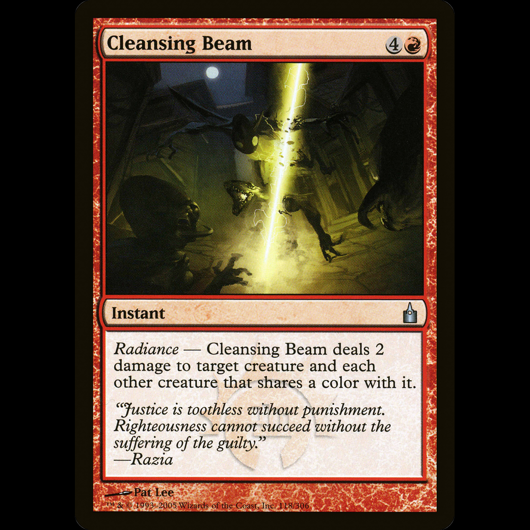 Radiance — Cleansing Beam deals 2 damage to target creature and each other creature that shares a color with it.