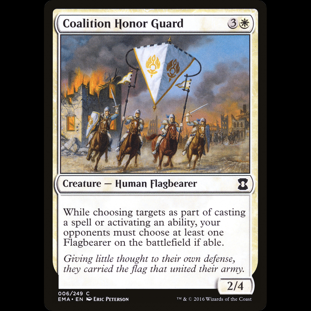 While an opponent is choosing targets as part of casting a spell they control or activating an ability they control, that player must choose at least one Flagbearer on the battlefield if able.