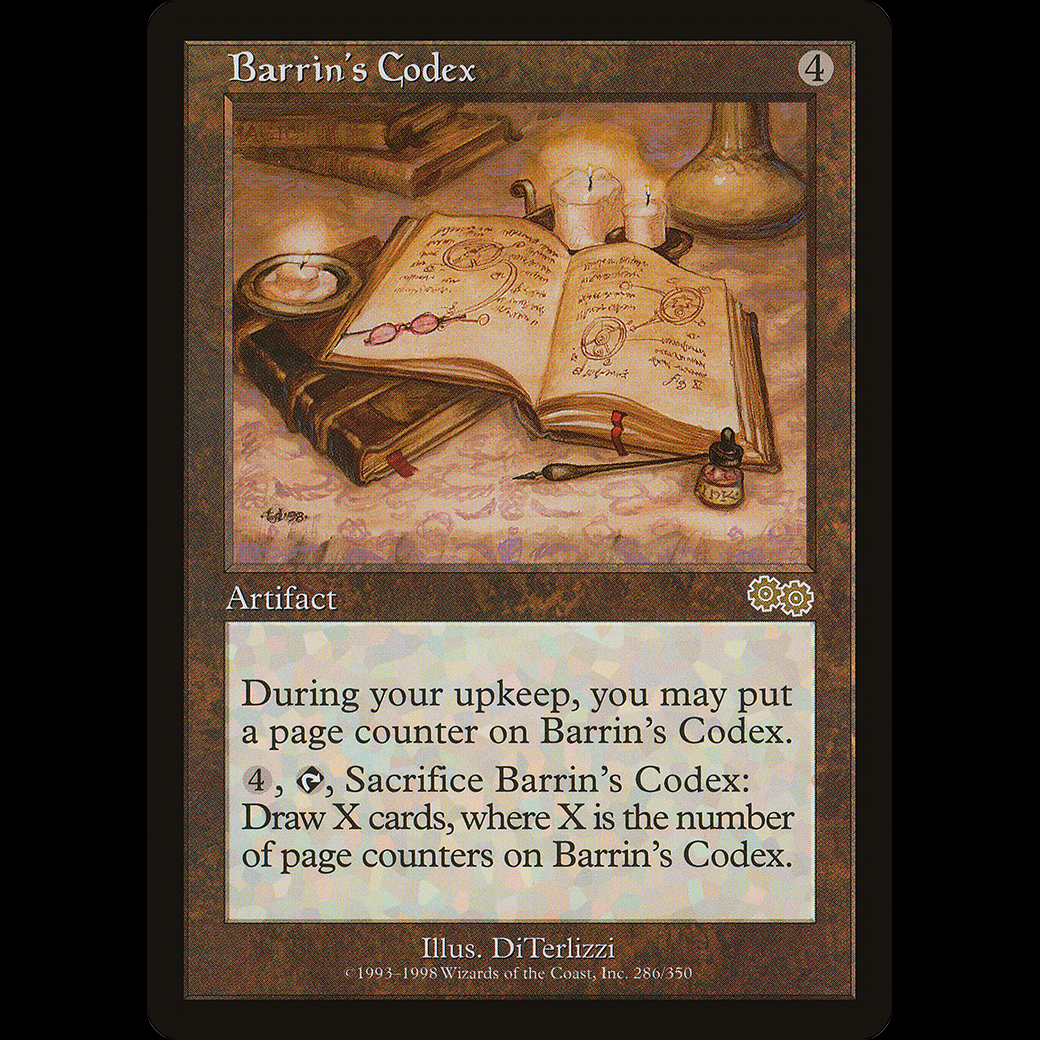 MTG Codice de Barrin (Barrin's Codex) Urza's SagaAt the beginning of your upkeep, you may put a page counter on Barrin's Codex. , , Sacrifice Barrin's Codex: Draw X cards, where X is the number of page counters on Barrin's Codex.