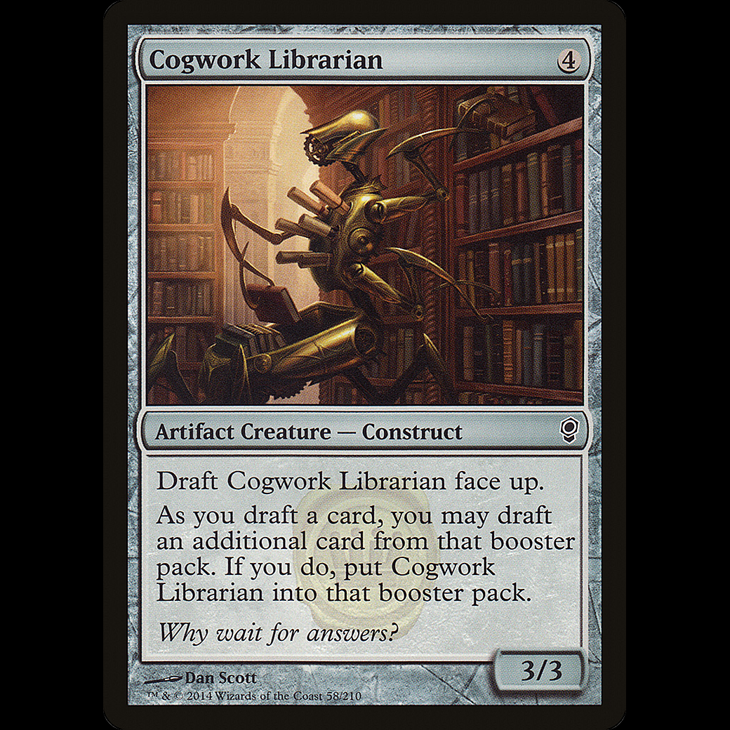 As you draft a card, you may draft an additional card from that booster pack. If you do, put Cogwork Librarian into that booster pack.
