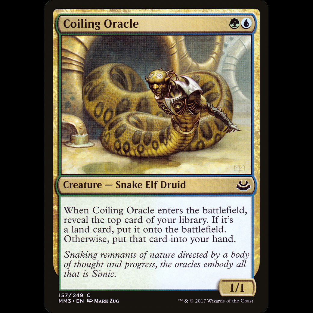 When Coiling Oracle enters the battlefield, reveal the top card of your library. If it's a land card, put it onto the battlefield. Otherwise, put that card into your hand.