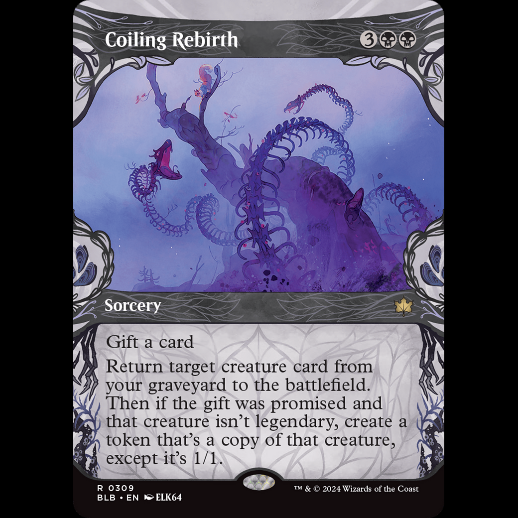 Return target creature card from your graveyard to the battlefield. Then if the gift was promised and that creature isn't legendary, create a token that's a copy of that creature, except it's 1/1.
