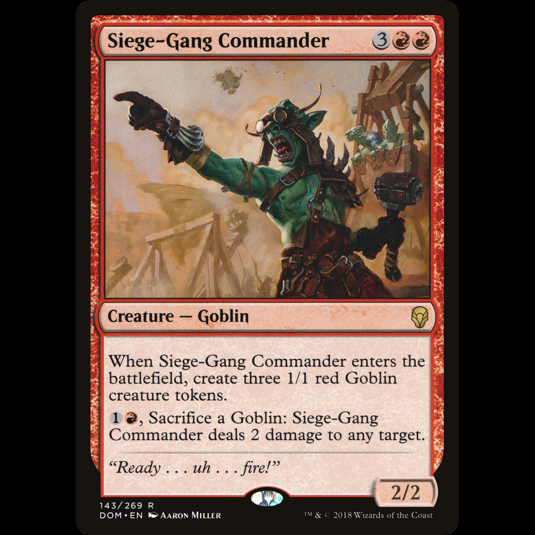When Siege-Gang Commander enters the battlefield, create three 1/1 red Goblin creature tokens.
