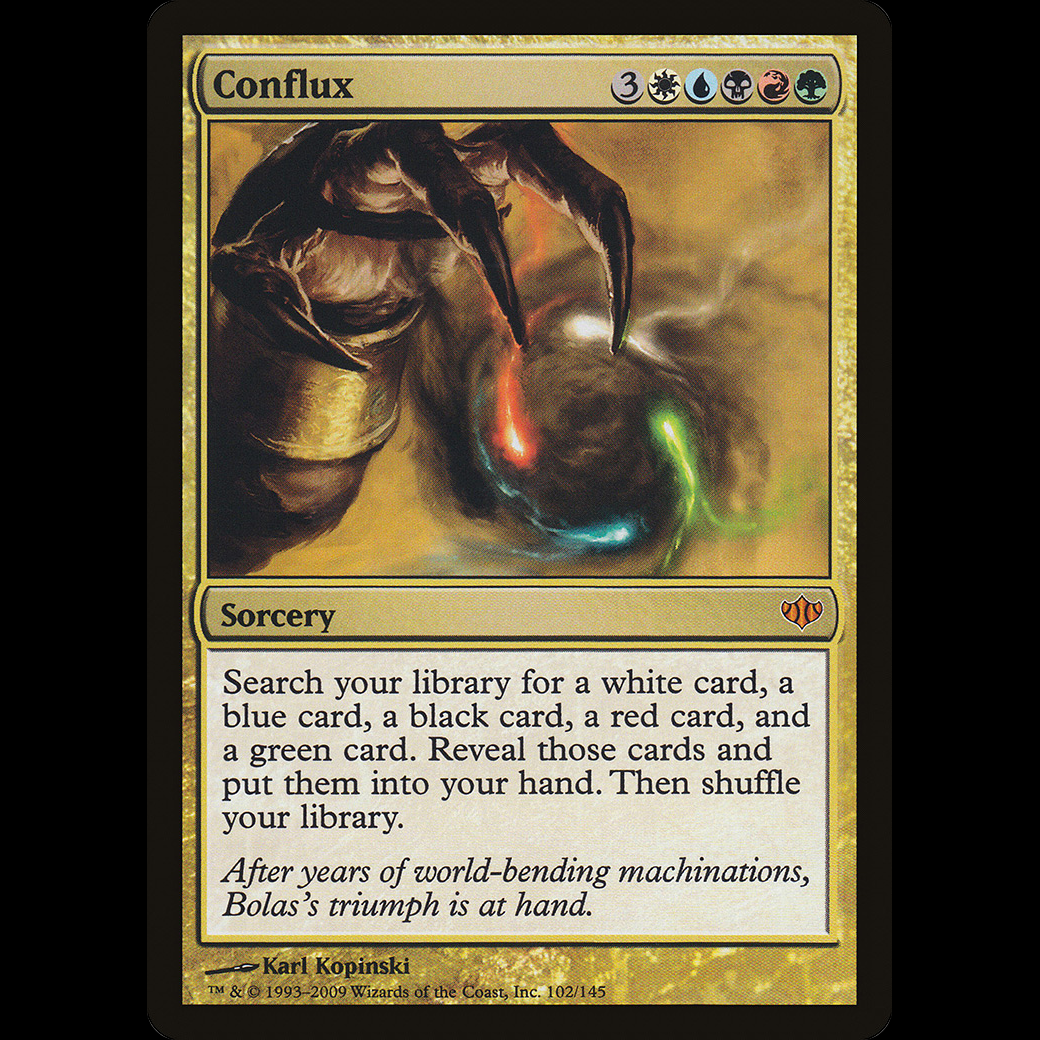 Search your library for a white card, a blue card, a black card, a red card, and a green card. Reveal those cards, put them into your hand, then shuffle.