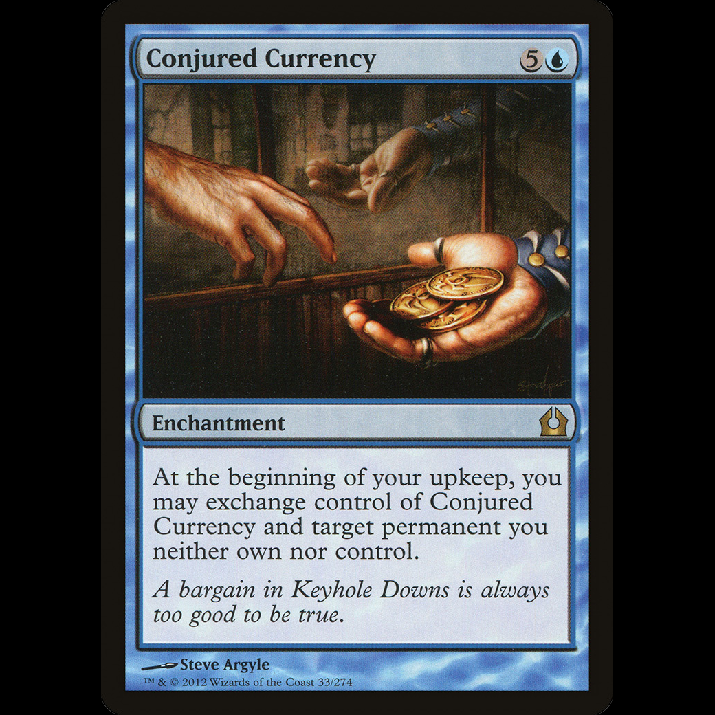 At the beginning of your upkeep, you may exchange control of Conjured Currency and target permanent you neither own nor control.