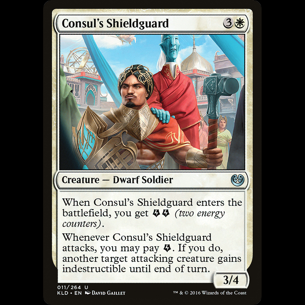 Whenever Consul's Shieldguard attacks, you may pay . If you do, another target attacking creature gains indestructible until end of turn.