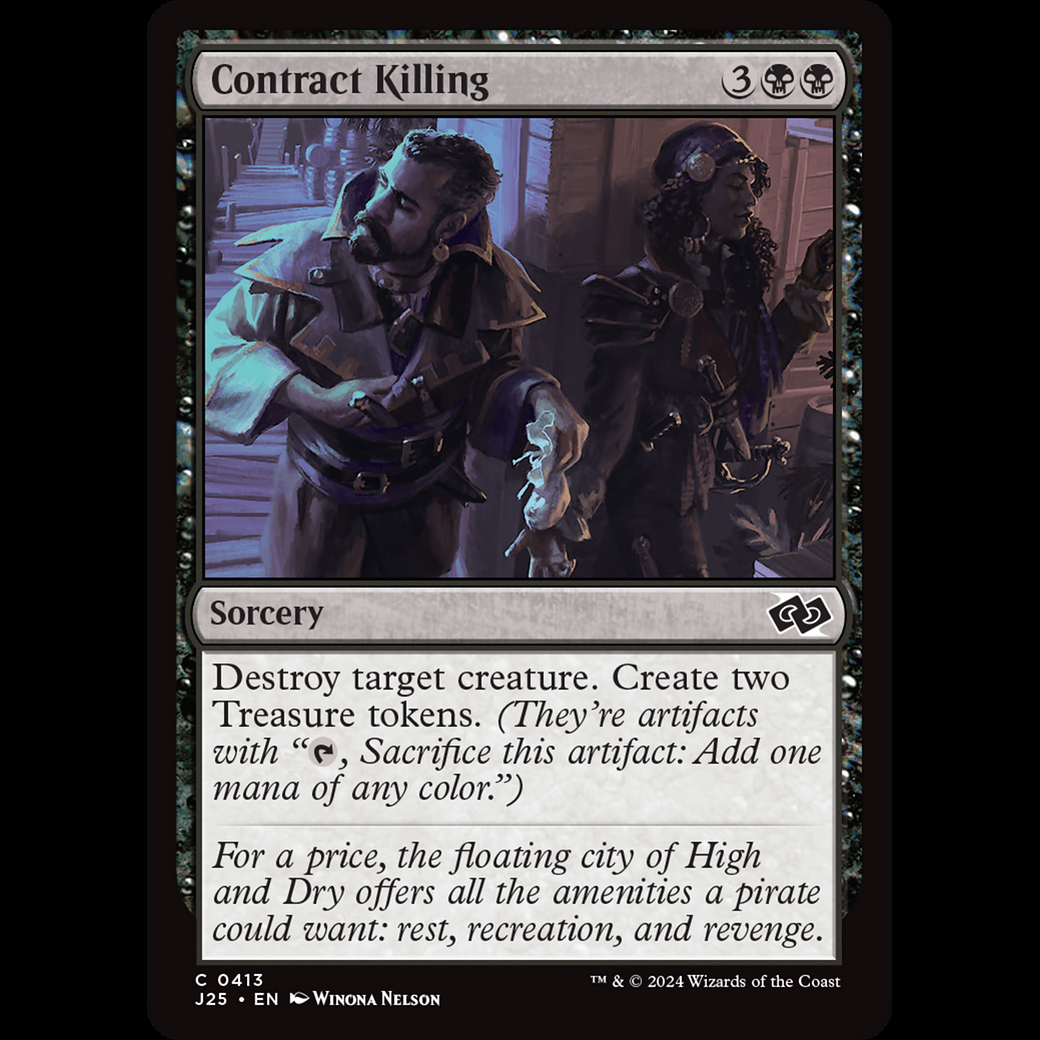 Destroy target creature. Create two Treasure tokens. (They're artifacts with ", Sacrifice this artifact: Add one mana of any color.")
