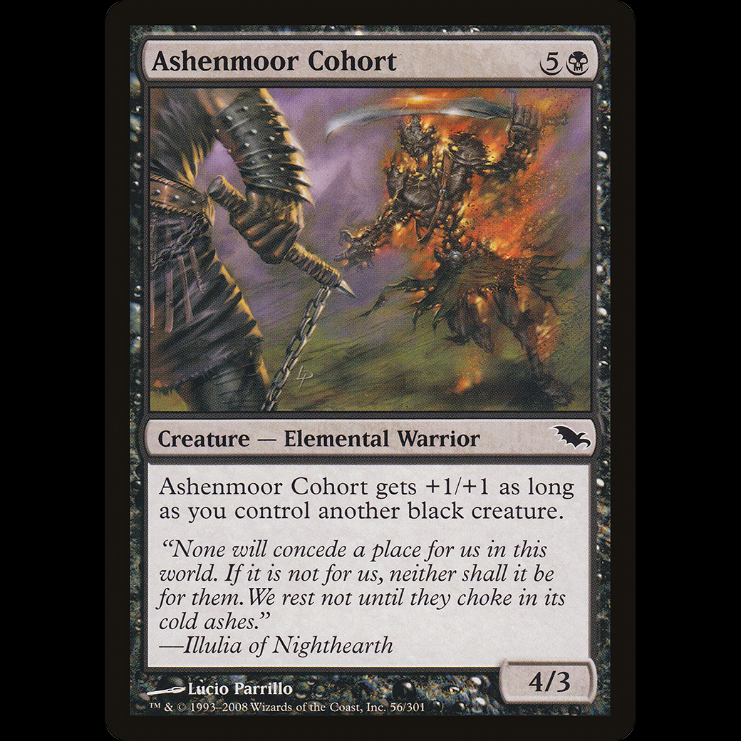 Ashenmoor Cohort gets +1/+1 as long as you control another black creature.