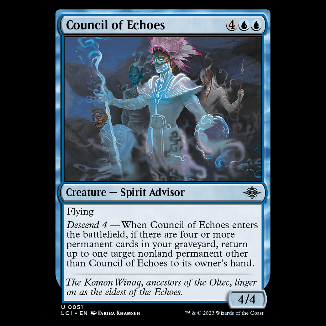Descend 4 — When Council of Echoes enters the battlefield, if there are four or more permanent cards in your graveyard, return up to one target nonland permanent other than Council of Echoes to its owner's hand.