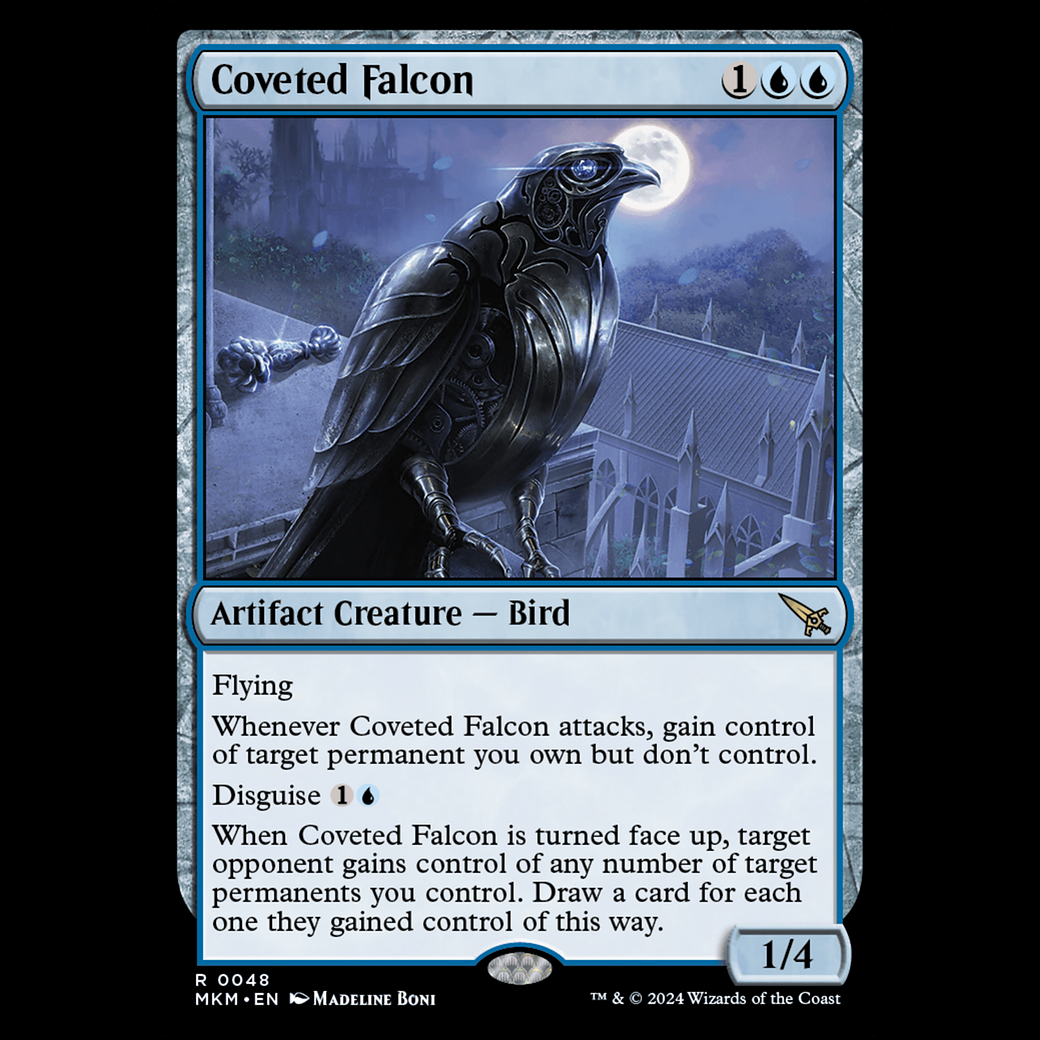 When Coveted Falcon is turned face up, target opponent gains control of any number of target permanents you control. Draw a card for each one they gained control of this way.