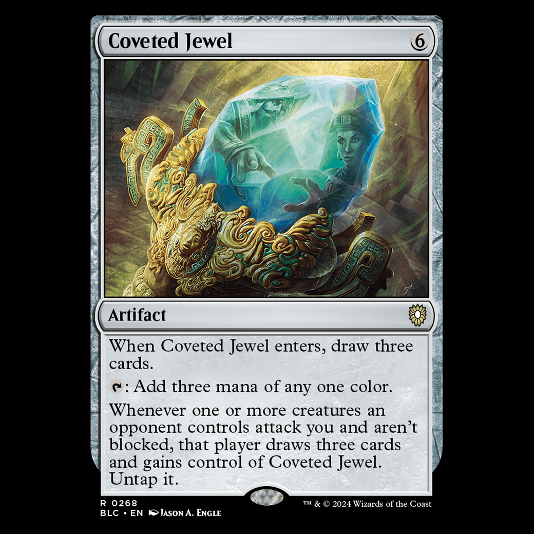 Whenever one or more creatures an opponent controls attack you and aren't blocked, that player draws three cards and gains control of Coveted Jewel. Untap it.