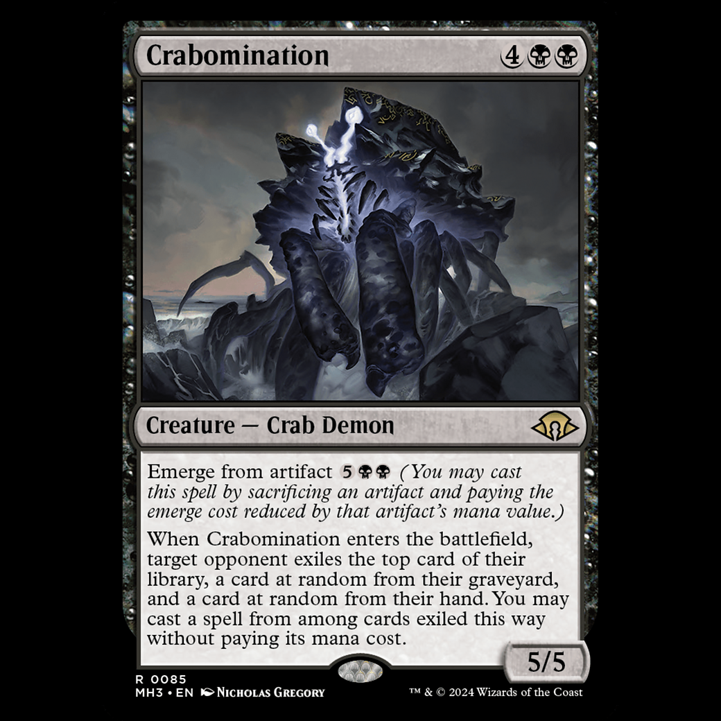 When Crabomination enters the battlefield, target opponent exiles the top card of their library, a card at random from their graveyard, and a card at random from their hand. You may cast a spell from among cards exiled this way without paying its mana cost.