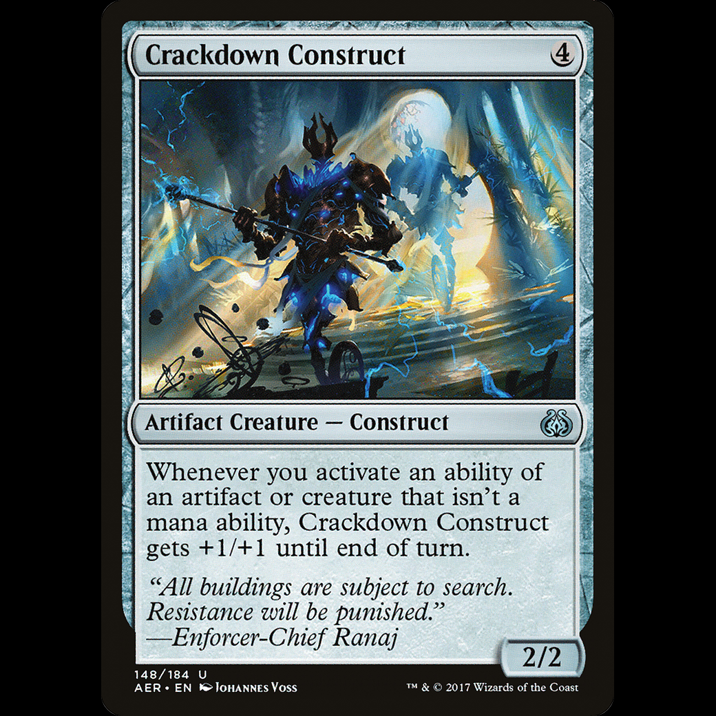 Whenever you activate an ability of an artifact or creature that isn't a mana ability, Crackdown Construct gets +1/+1 until end of turn.