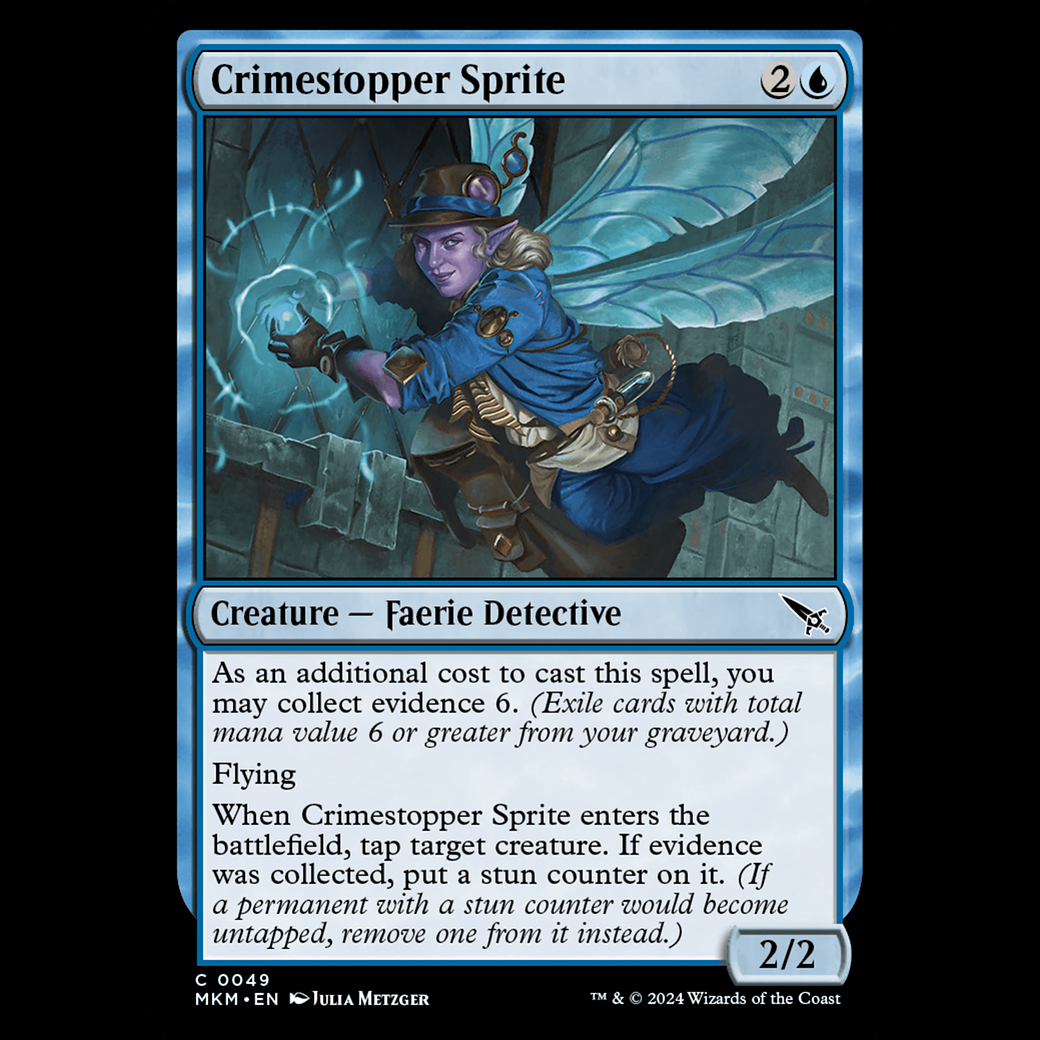 When Crimestopper Sprite enters the battlefield, tap target creature. If evidence was collected, put a stun counter on it. (If a permanent with a stun counter would become untapped, remove one from it instead.)