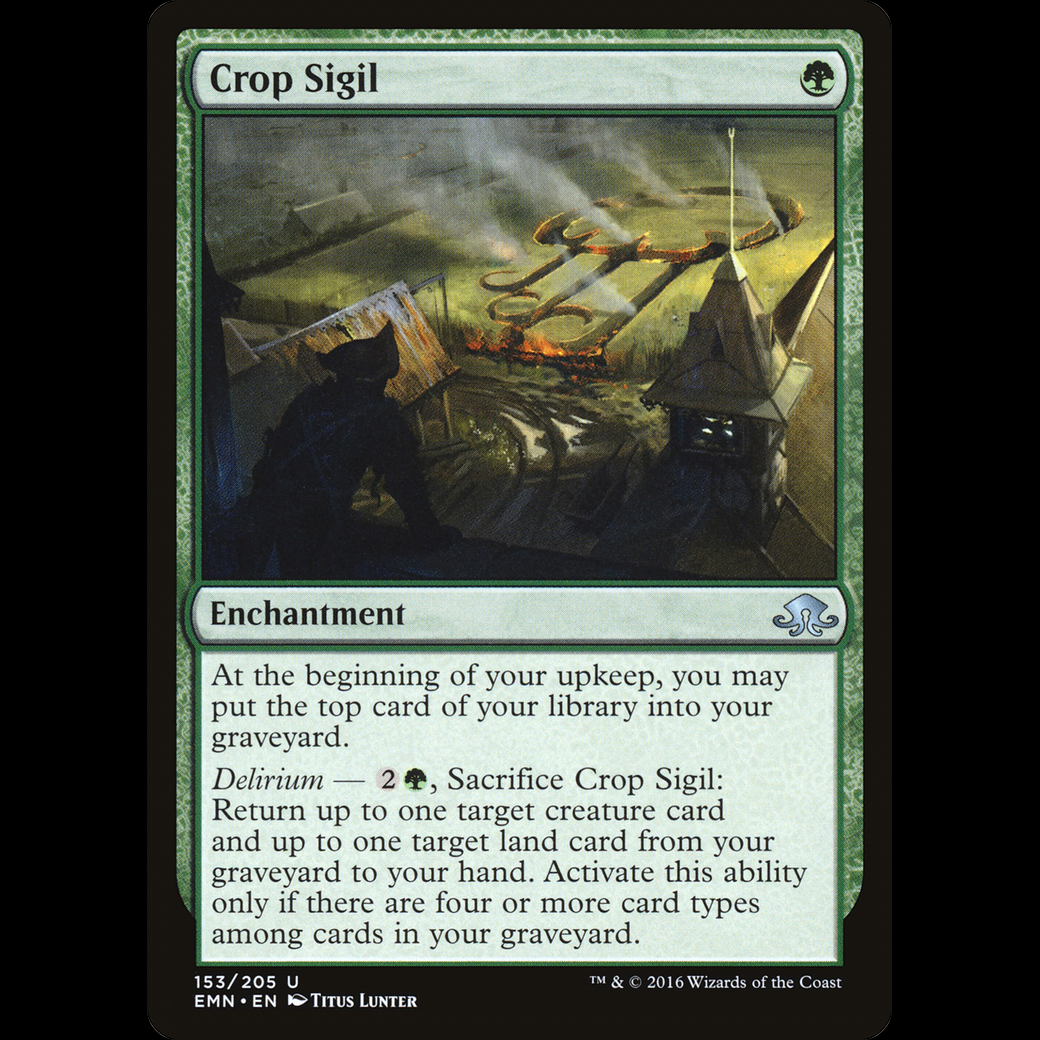 Delirium — , Sacrifice Crop Sigil: Return up to one target creature card and up to one target land card from your graveyard to your hand. Activate only if there are four or more card types among cards in your graveyard.