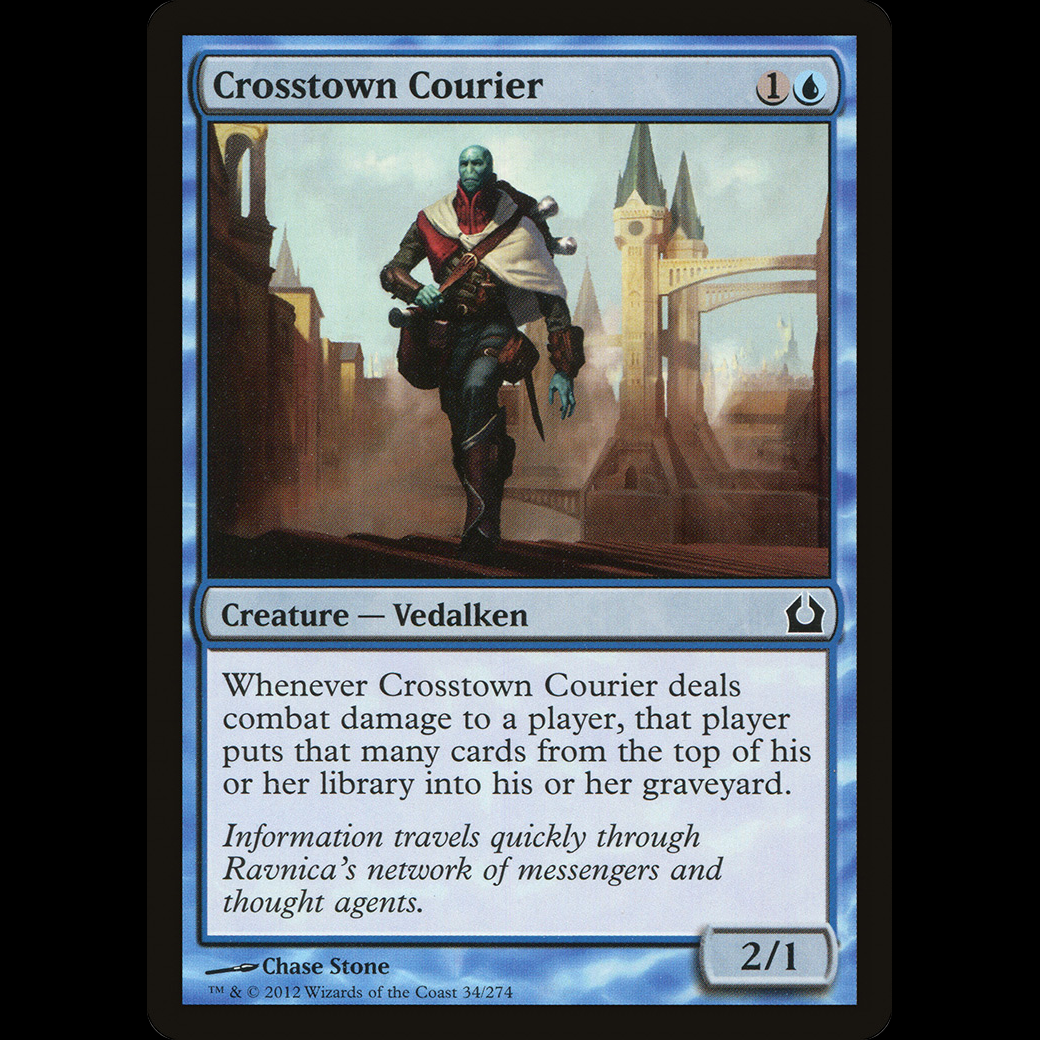 Whenever Crosstown Courier deals combat damage to a player, that player mills that many cards.