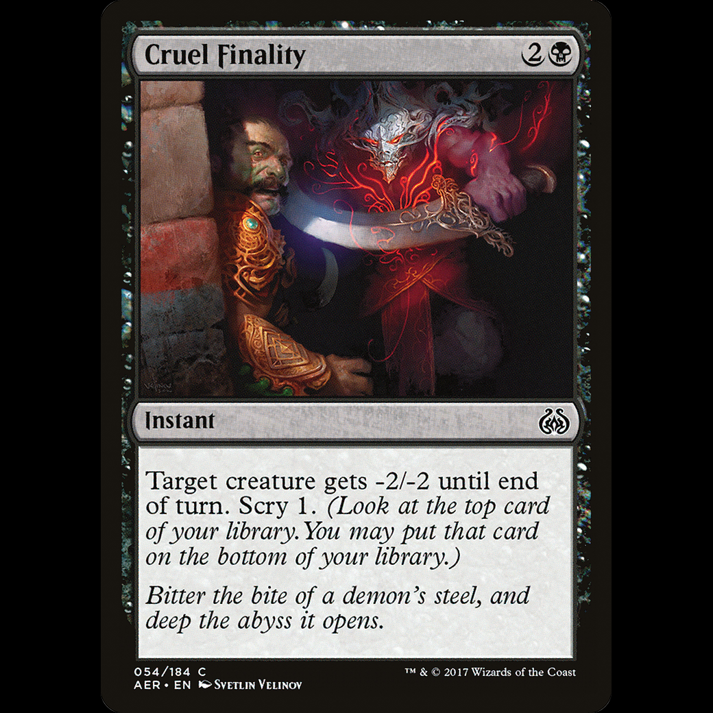 Target creature gets -2/-2 until end of turn. Scry 1. (Look at the top card of your library. You may put that card on the bottom of your library.)