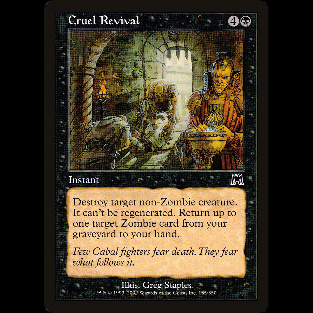 Destroy target non-Zombie creature. It can't be regenerated. Return up to one target Zombie card from your graveyard to your hand.