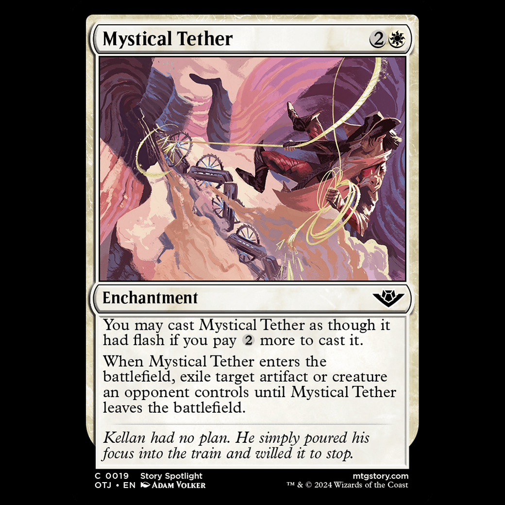 MTG Cuerda mística (Mystical Tether) Outlaws of Thunder Junction otj#19 You may cast Mystical Tether as though it had flash if you pay more to cast it. When Mystical Tether enters, exile target artifact or creature an opponent controls until Mystical Tether leaves the battlefield.