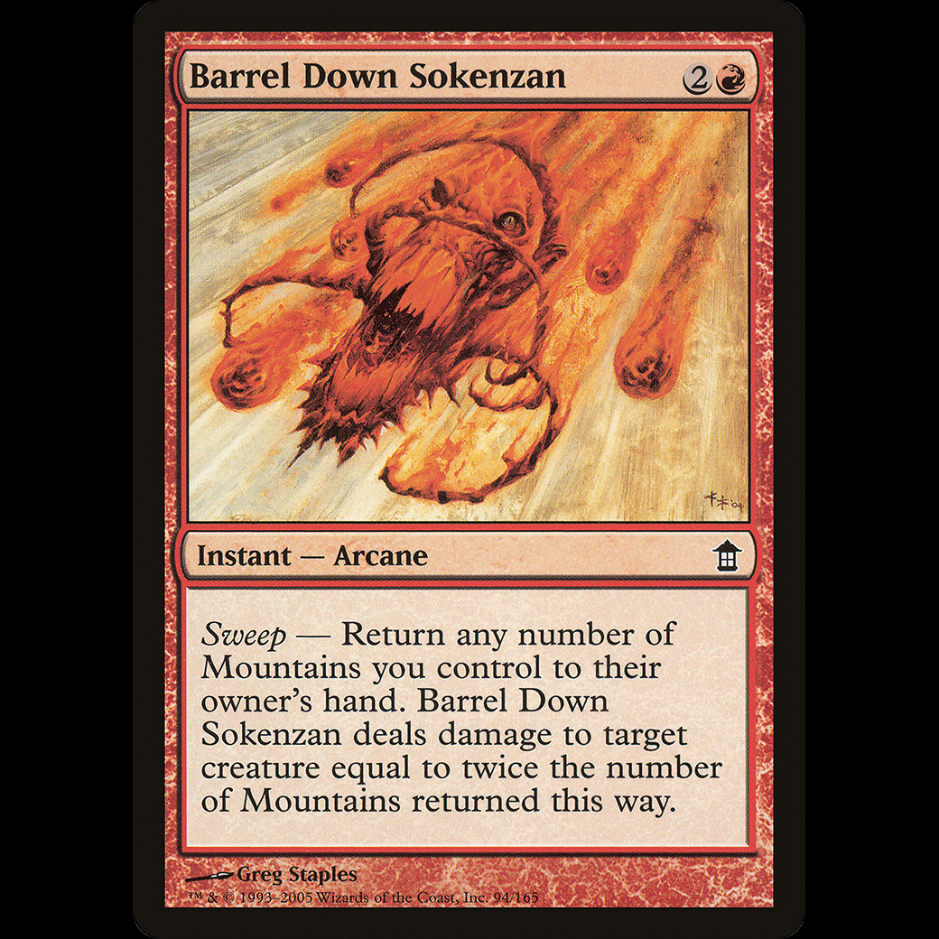 Sweep — Return any number of Mountains you control to their owner's hand. Barrel Down Sokenzan deals damage to target creature equal to twice the number of Mountains returned this way.