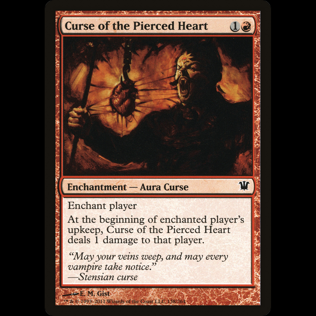 At the beginning of enchanted player's upkeep, Curse of the Pierced Heart deals 1 damage to that player or a planeswalker that player controls.