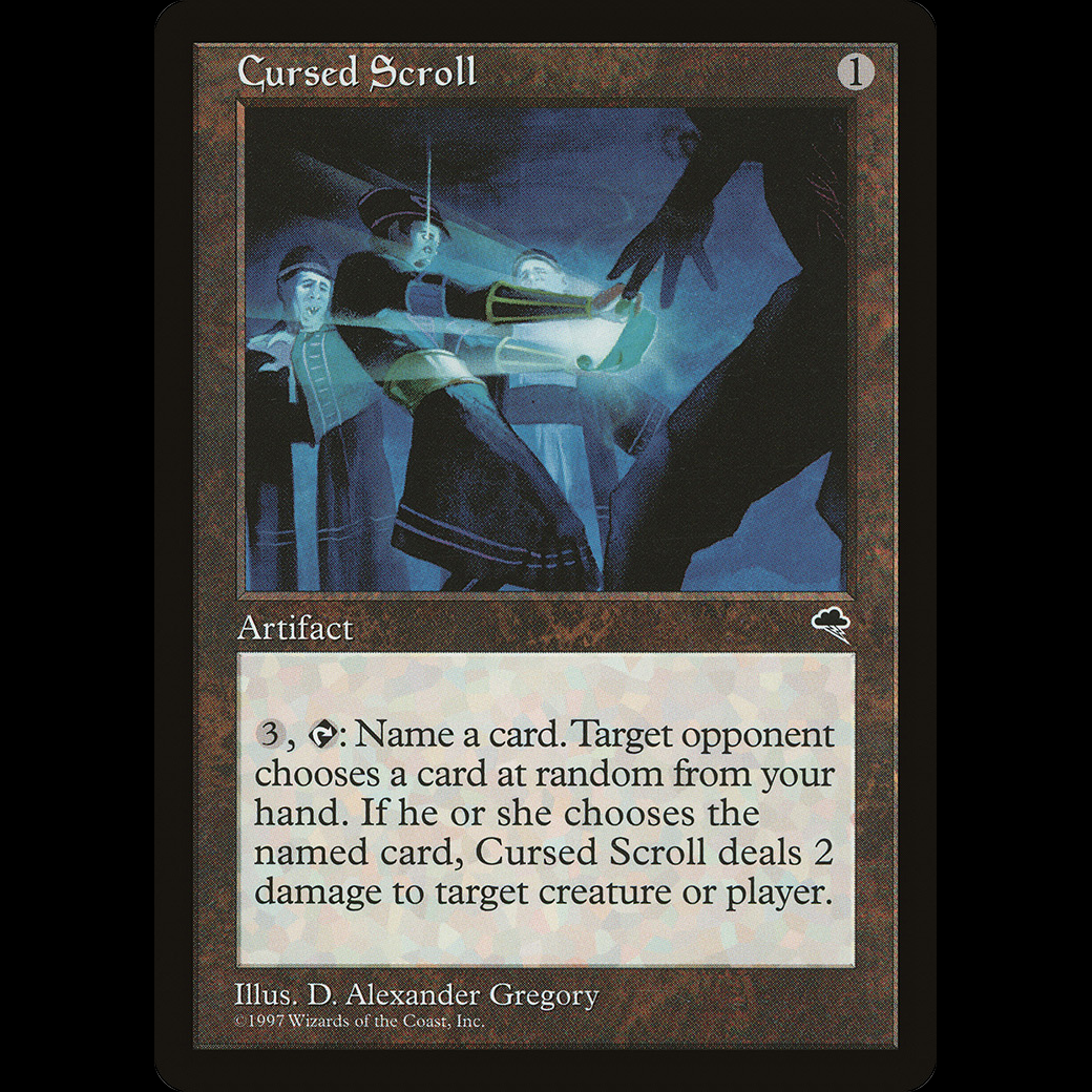 , : Choose a card name, then reveal a card at random from your hand. If that card has the chosen name, Cursed Scroll deals 2 damage to any target.