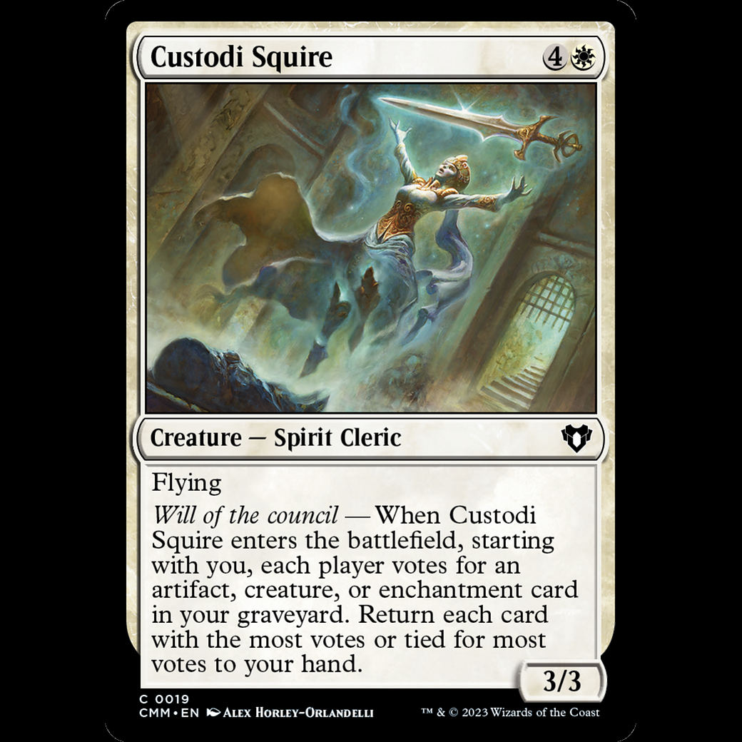 Will of the council — When Custodi Squire enters, starting with you, each player votes for an artifact, creature, or enchantment card in your graveyard. Return each card with the most votes or tied for most votes to your hand.