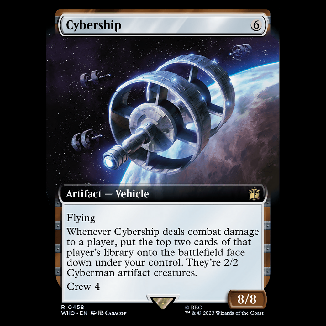 Whenever Cybership deals combat damage to a player, put the top two cards of that player's library onto the battlefield face down under your control. They're 2/2 Cyberman artifact creatures.