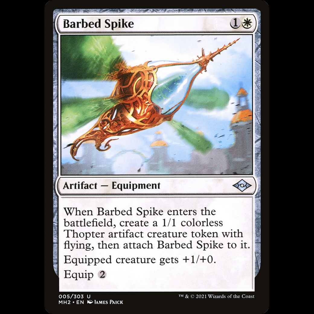 MTG Dardo espinoso (Barbed Spike) Modern Horizons 2 mh2#5When this Equipment enters, create a 1/1 colorless Thopter artifact creature token with flying, then attach this Equipment to it. Equipped creature gets +1/+0. Equip