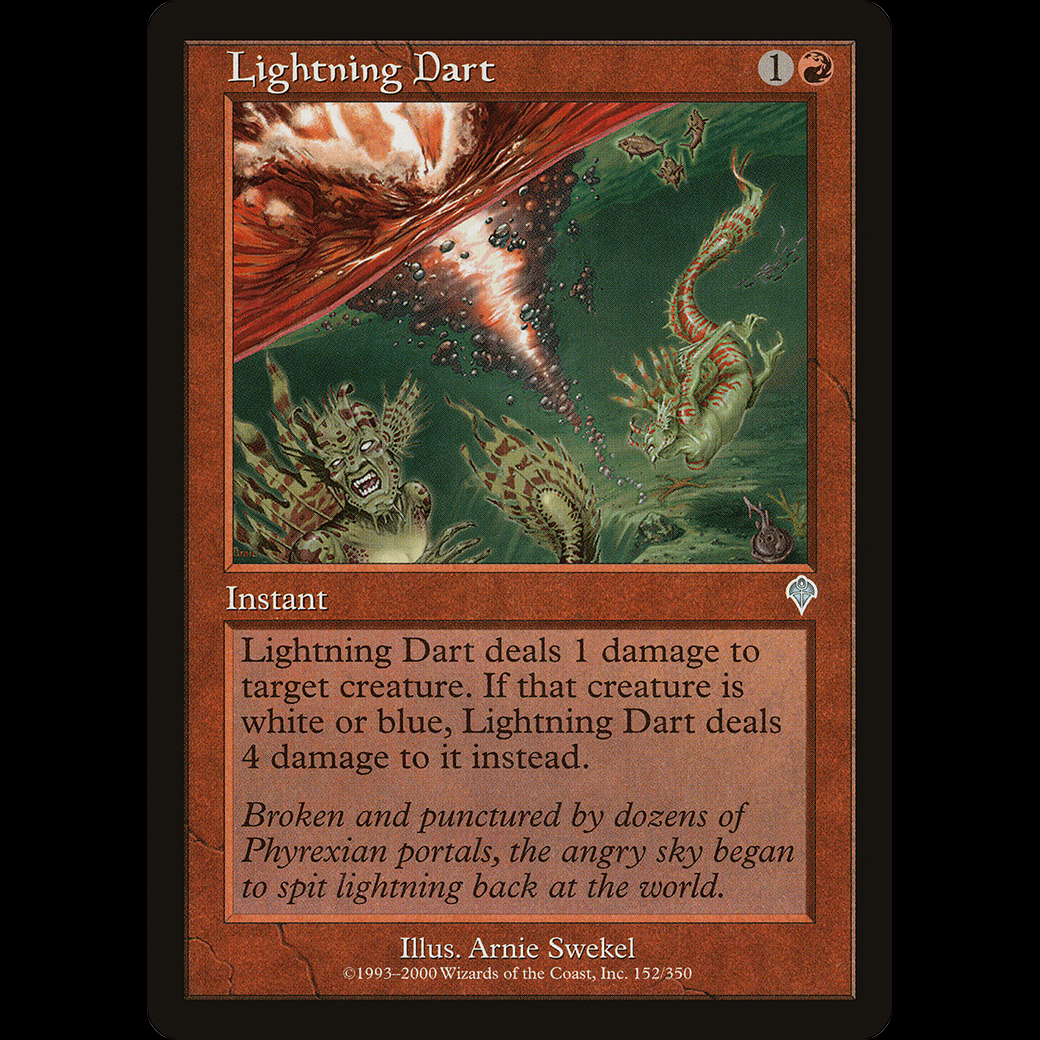 Lightning Dart deals 1 damage to target creature. If that creature is white or blue, Lightning Dart deals 4 damage to it instead.