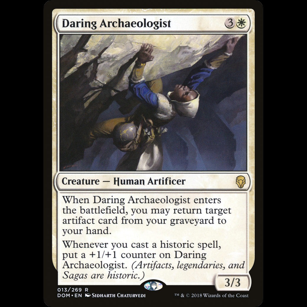 Whenever you cast a historic spell, put a +1/+1 counter on Daring Archaeologist. (Artifacts, legendaries, and Sagas are historic.)