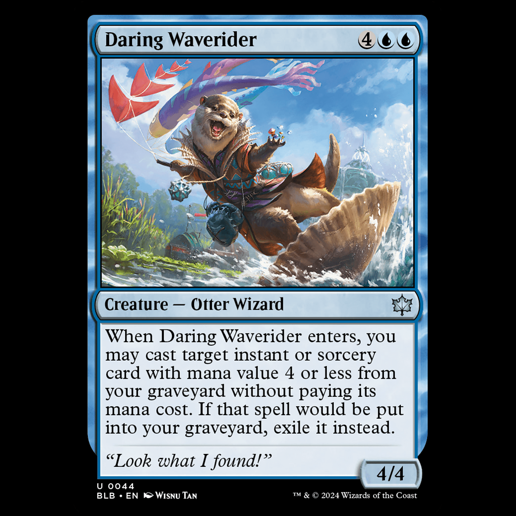 When Daring Waverider enters, you may cast target instant or sorcery card with mana value 4 or less from your graveyard without paying its mana cost. If that spell would be put into your graveyard, exile it instead.
