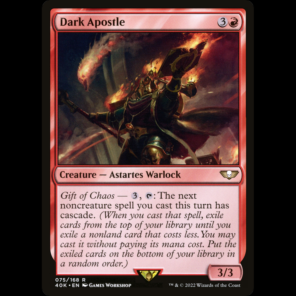 MTG Dark Apostle Warhammer 40,000 Commander 40k#75 Gift of Chaos — , : The next noncreature spell you cast this turn has cascade. (When you cast that spell, exile cards from the top of your library until you exile a nonland card that costs less. You may cast it without paying its mana cost. Put the exiled cards on the bottom in a random order.)