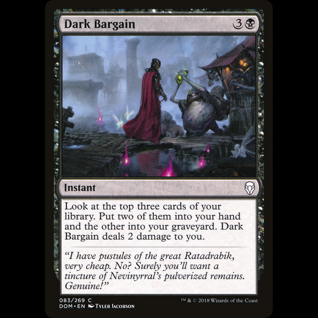 MTG Dark Bargain Dominaria dom#83Look at the top three cards of your library. Put two of them into your hand and the other into your graveyard. Dark Bargain deals 2 damage to you.