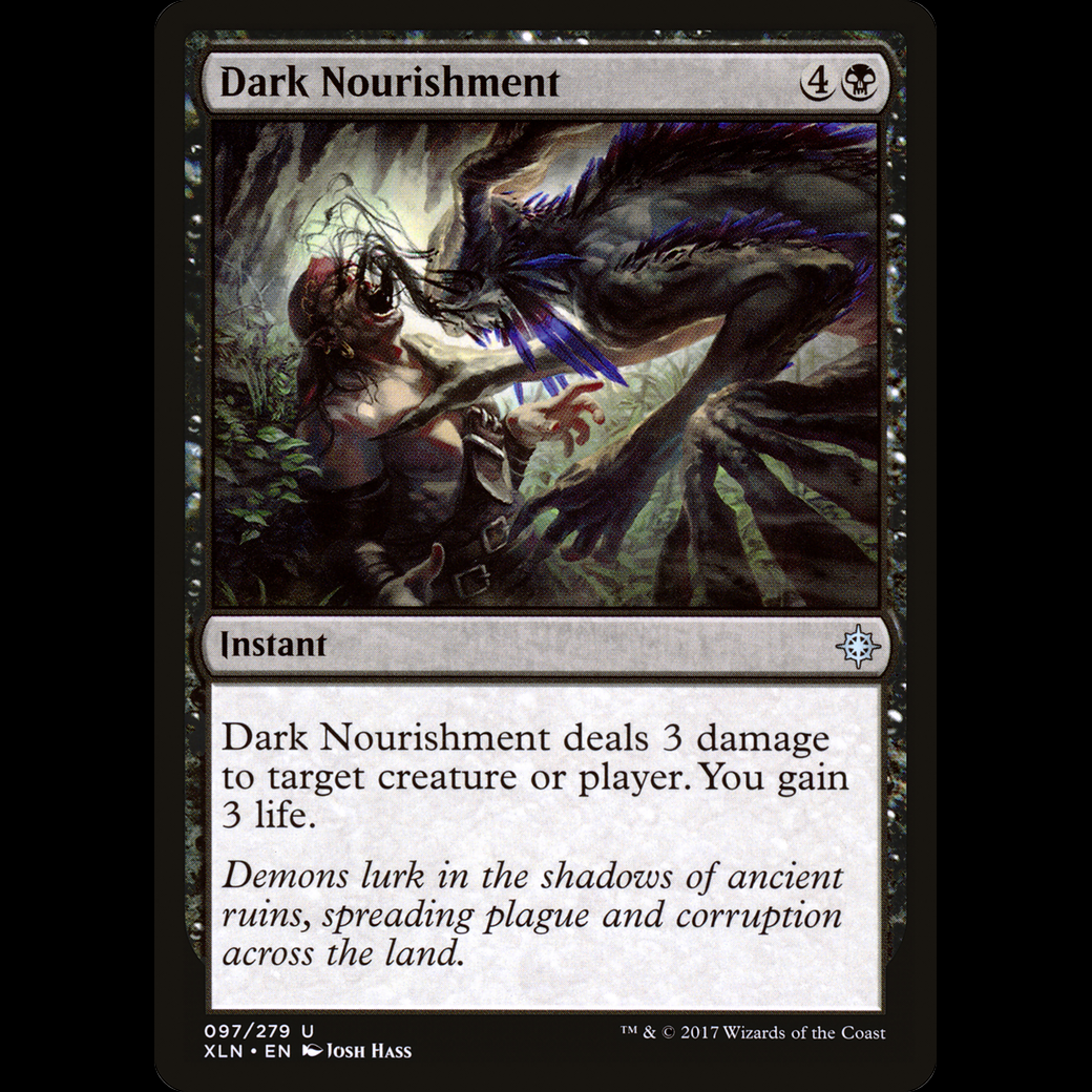 MTG Dark Nourishment IxalanDark Nourishment deals 3 damage to any target. You gain 3 life.