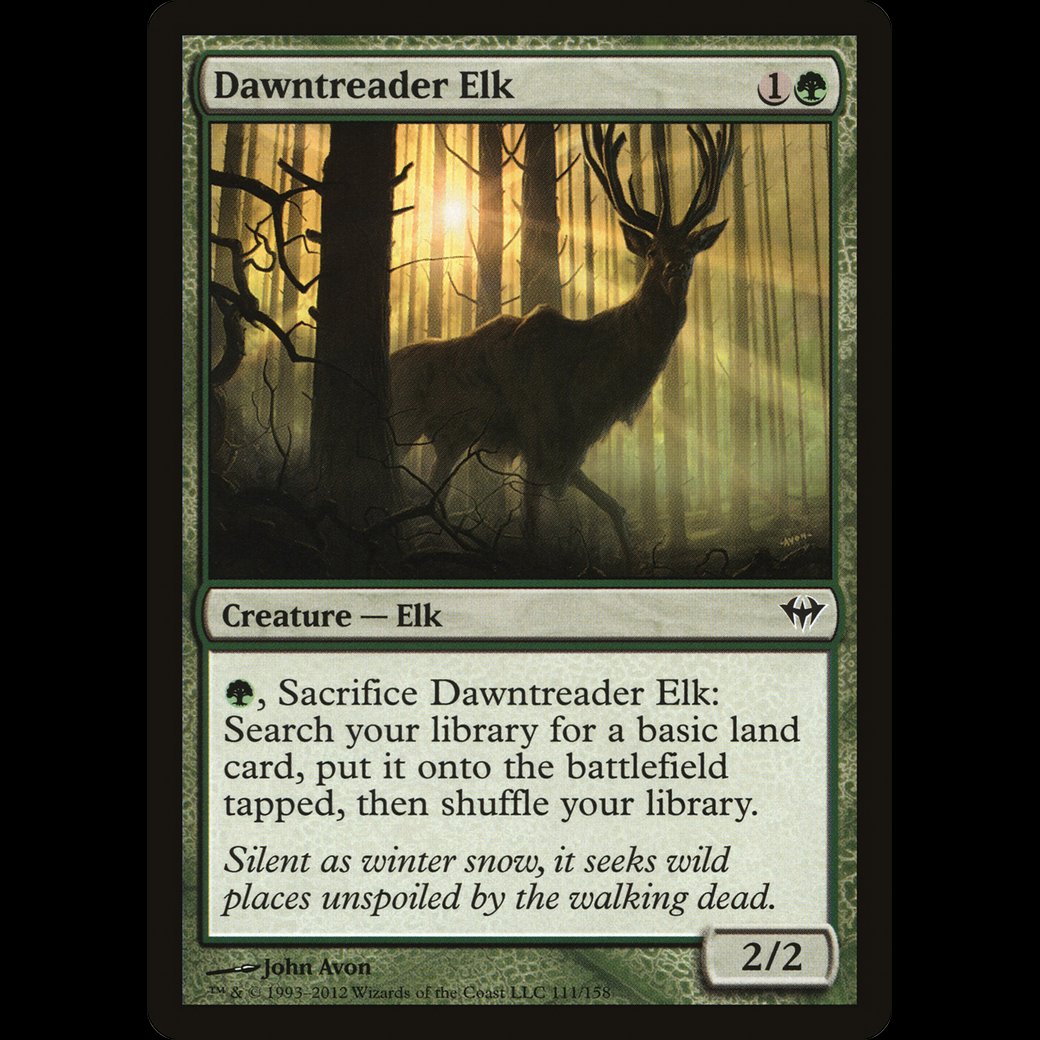 , Sacrifice Dawntreader Elk: Search your library for a basic land card, put it onto the battlefield tapped, then shuffle.