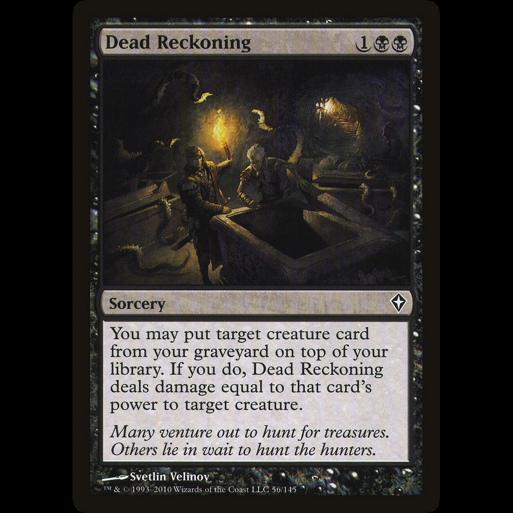 You may put target creature card from your graveyard on top of your library. If you do, Dead Reckoning deals damage equal to that card's power to target creature.