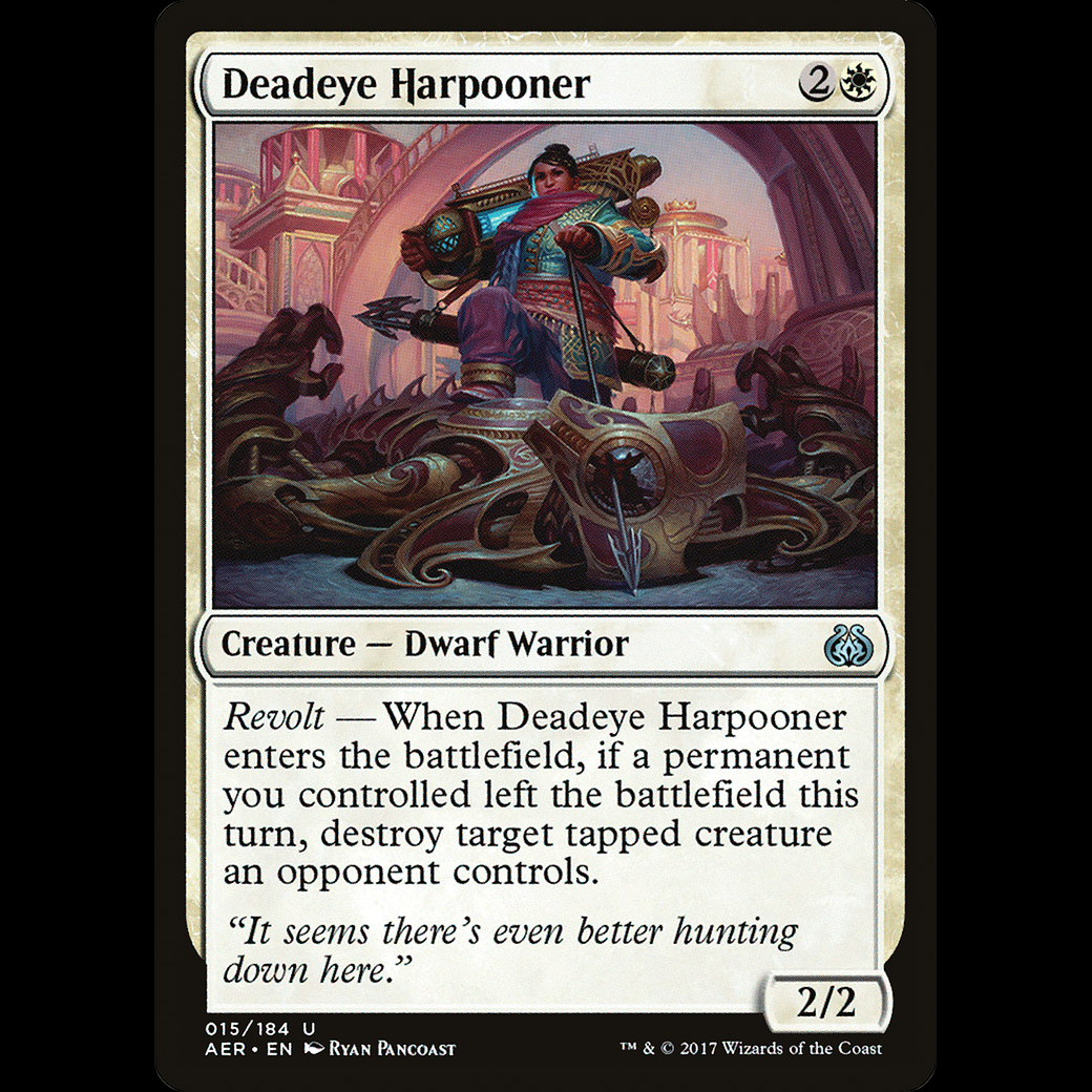 Revolt — When Deadeye Harpooner enters the battlefield, if a permanent you controlled left the battlefield this turn, destroy target tapped creature an opponent controls.