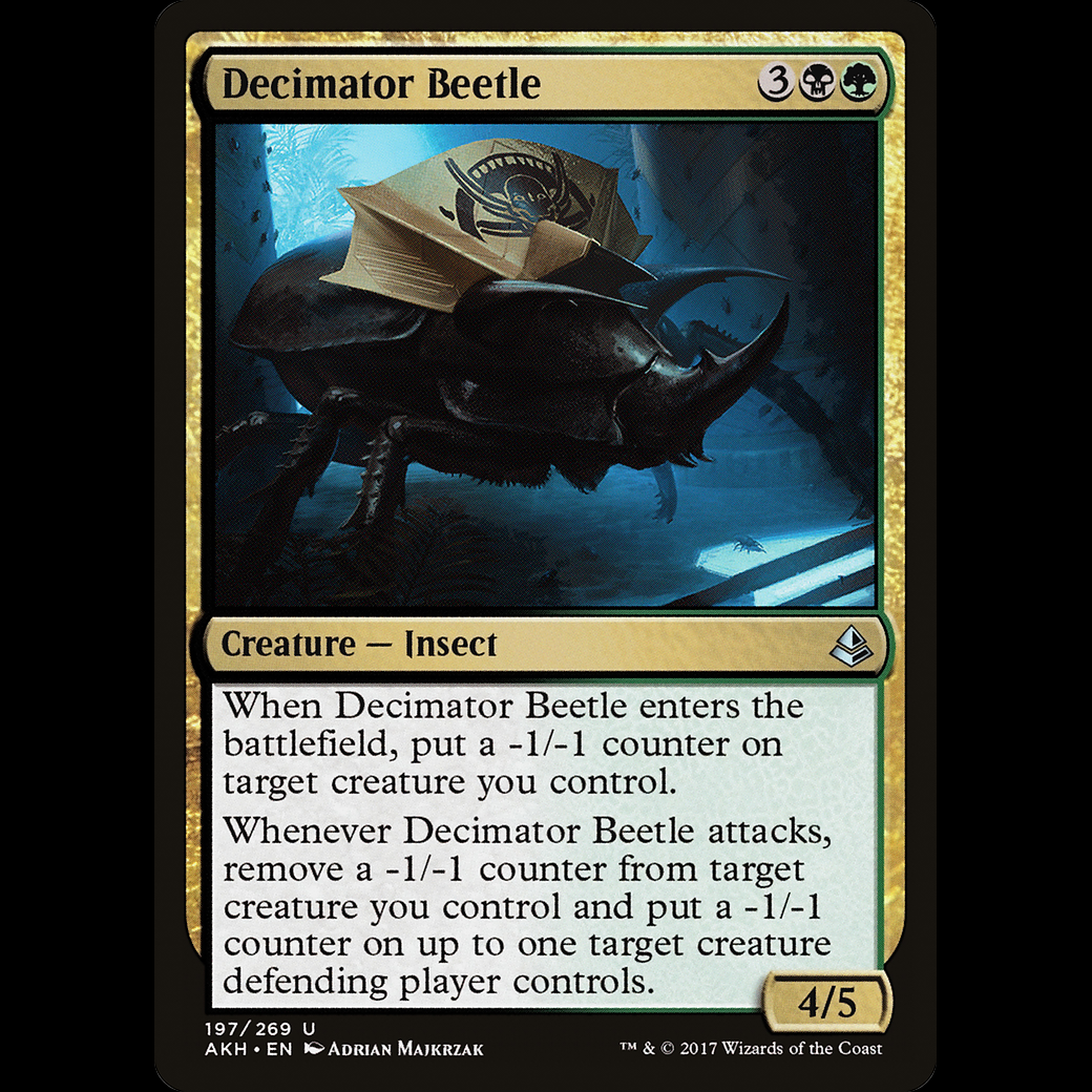 When Decimator Beetle enters the battlefield, put a -1/-1 counter on target creature you control.