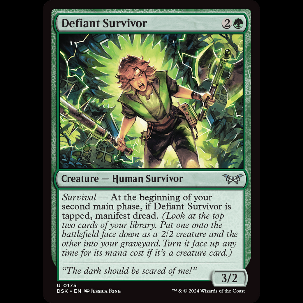 Survival — At the beginning of your second main phase, if Defiant Survivor is tapped, manifest dread. (Look at the top two cards of your library. Put one onto the battlefield face down as a 2/2 creature and the other into your graveyard. Turn it face up any time for its mana cost if it's a creature card.)