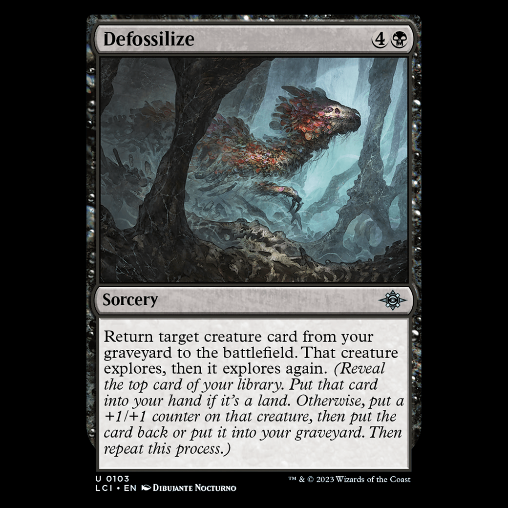 Return target creature card from your graveyard to the battlefield. That creature explores, then it explores again. (Reveal the top card of your library. Put that card into your hand if it's a land. Otherwise, put a +1/+1 counter on that creature, then put the card back or put it into your graveyard. Then repeat this process.)