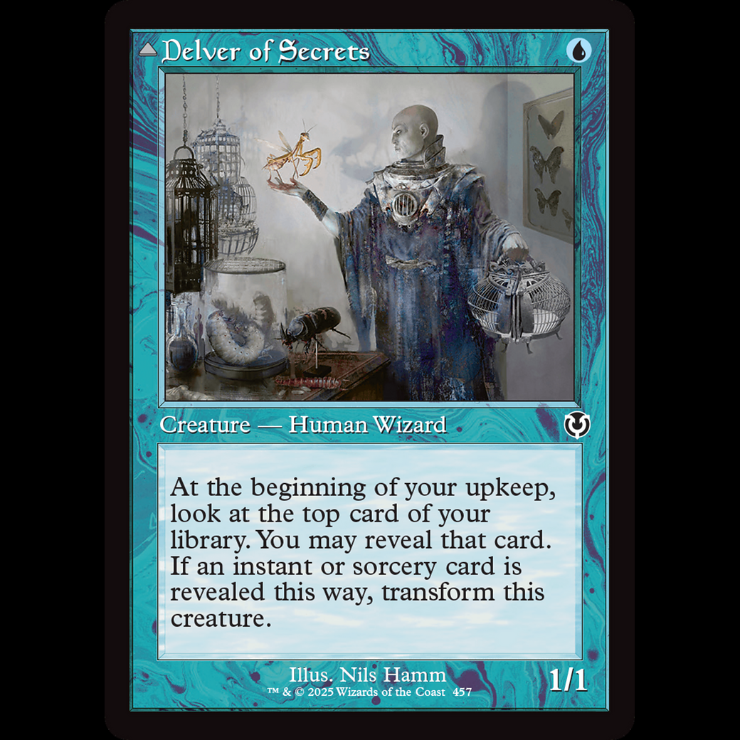 At the beginning of your upkeep, look at the top card of your library. You may reveal that card. If an instant or sorcery card is revealed this way, transform Delver of Secrets.